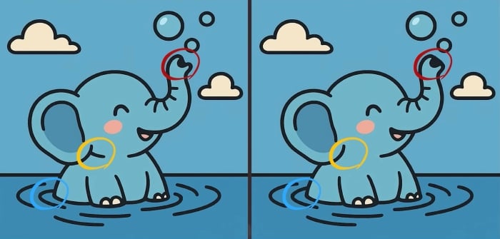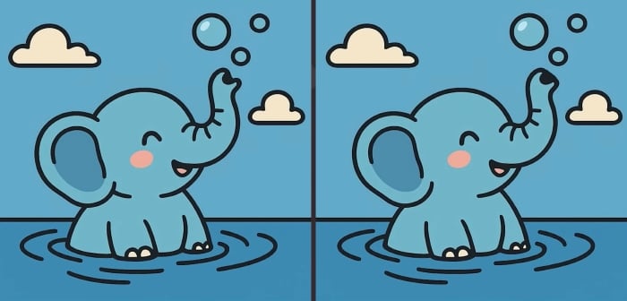 Siin on kaks pilti vees mängivast elevandist. Esmapilgul on need täiesti identsed, kuid see on vaid illusioon. Piltidel on peidus kolm väikest erinevust.