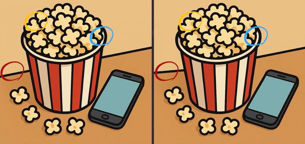 Siin on kaks pilti popkorni ämbriga. Esmapilgul on pildid täiesti identsed, kuid see on vaid illusioon. Nende vahel on peidus kolm väikest erinevust.