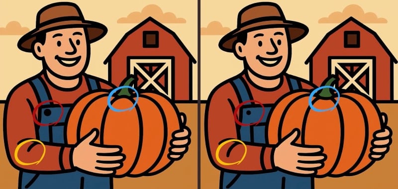 Seekord näete pilti taluniku ja kõrvitsaga. Esmapilgul langevad pildid täielikult kokku, kuid see pole nii – nende vahel on peidetud kolm erinevust.