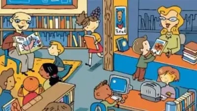 Pildil näeme paljude lastega raamatukogu. Mõned neist otsivad raamatuid, mida tahaksid lugeda, teised istuvad arvutite taga või suhtlevad omavahel.