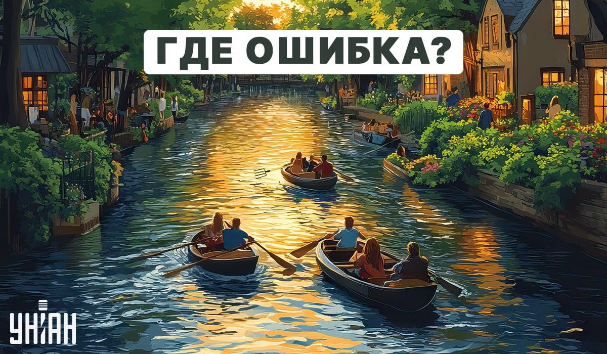 Siin on pilt, mis kujutab kaunist õhtust linnamaastikku. Majade vahelt voolab jõgi, mida mööda hõljuvad inimesed paatidega. Esmapilgul tundub pilt normaalne, kuid tegelikult on selles tõsine viga.