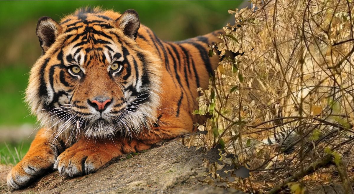 Kui te ei leia pildilt tiigrit kiiresti üles, anname teile väikese vihje – pöörake tähelepanu vaevumärgatavatele mustadele triipudele karusnaha taga tihniku taga.