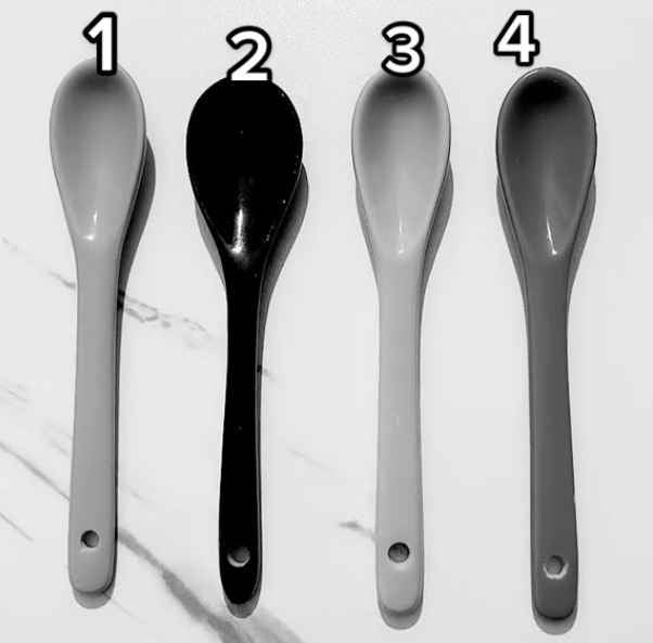Pildil näeme nelja lusikat, mis kahtlemata on erinevat värvi. Kuid fotolt on eemaldatud küllastus, mistõttu on raske kohe aru saada, mis värvi igal üksikul objektil on.